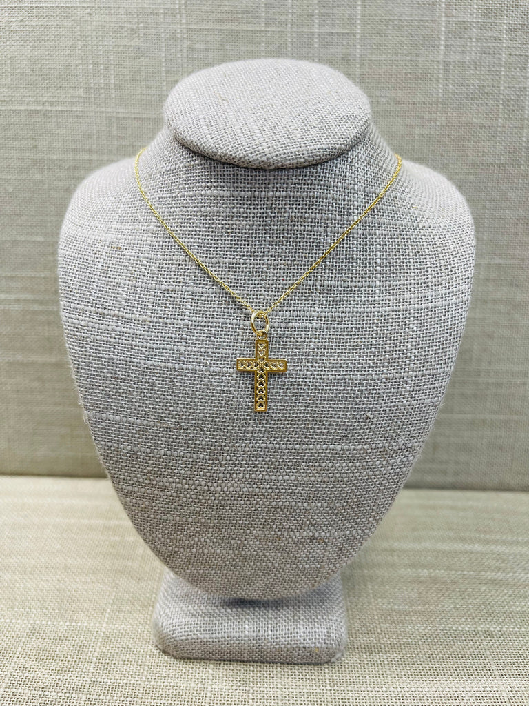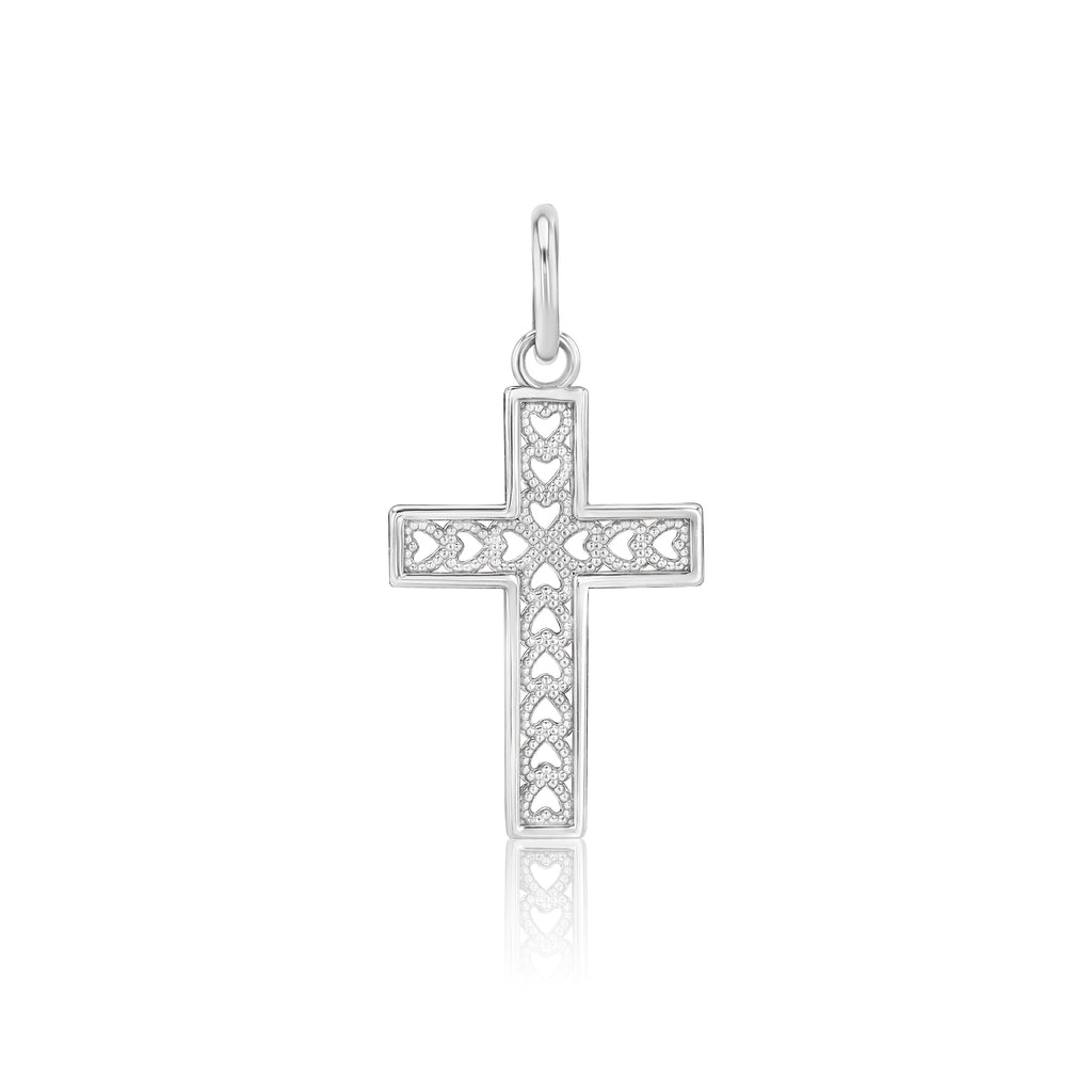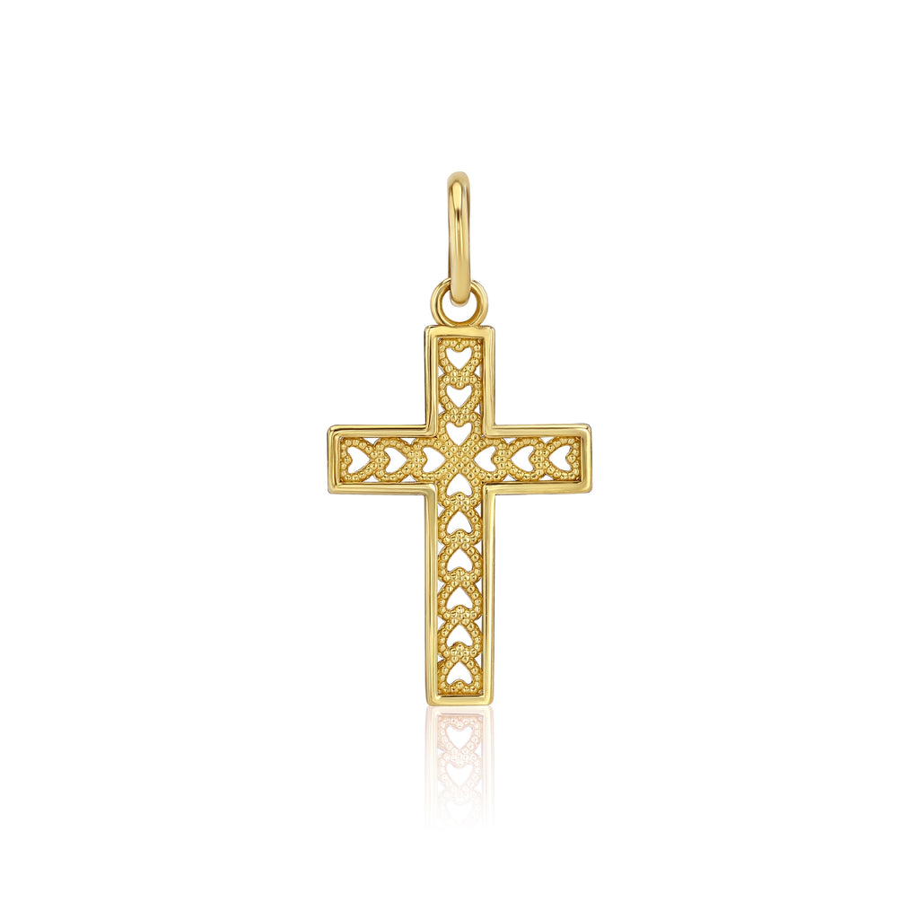 A solid gold charm featuring cutout heart details. A delicate gift for anyone.