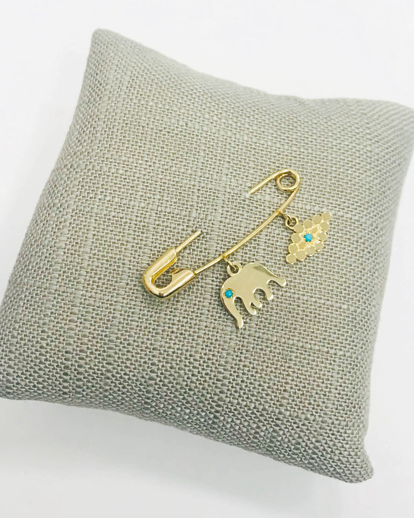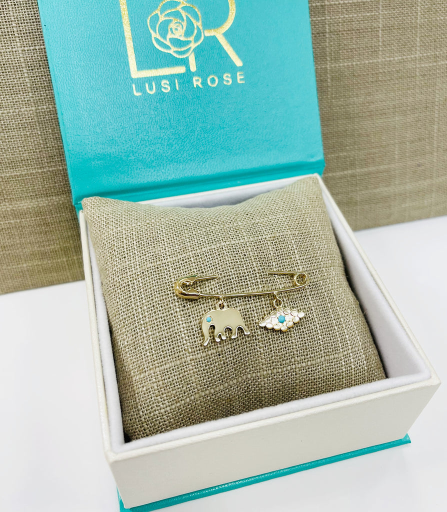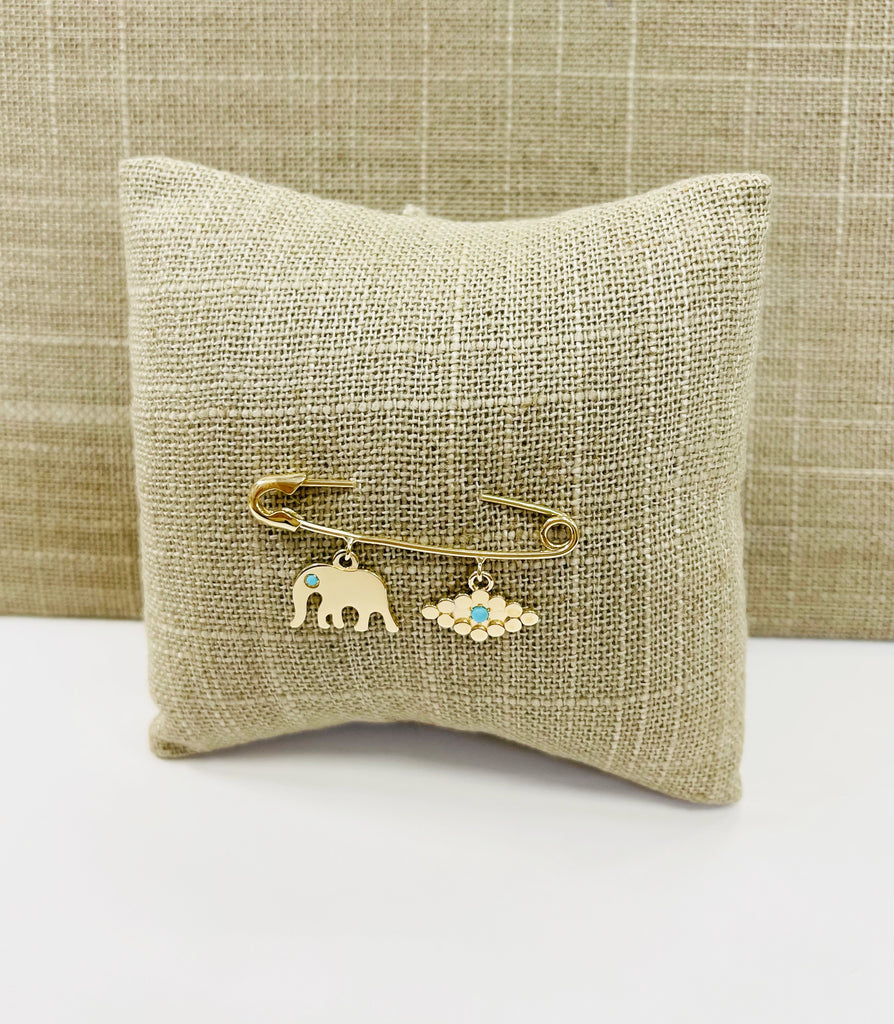 Pin features a Good Luck Elephant Charm and Modernized Evil Eye Charm, both set with 1.5mm Turquoise stones.