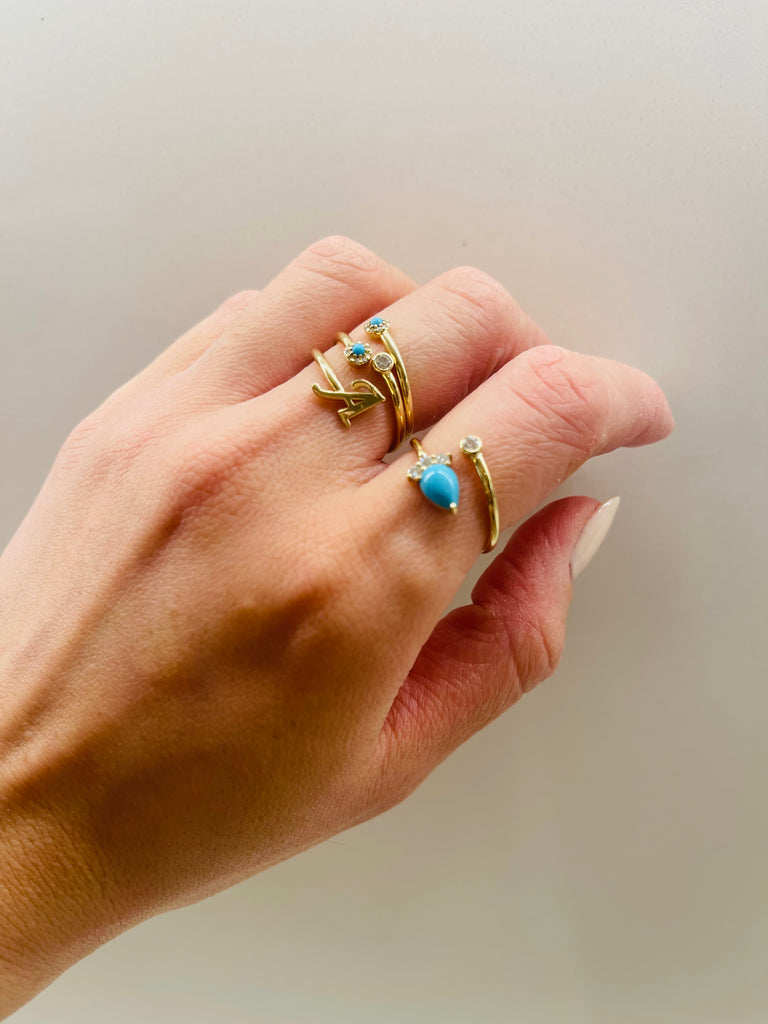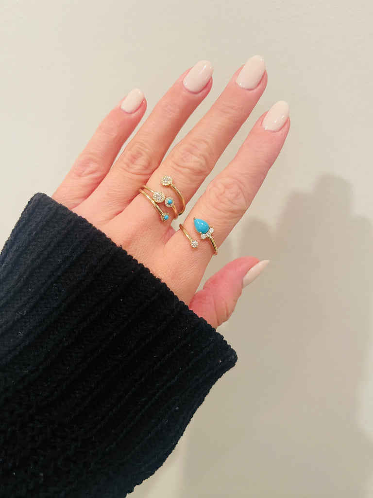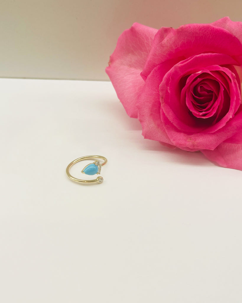 Adjustable accent ring with a 7x5mm pear shaped Turquoise stone surrounded by diamonds.